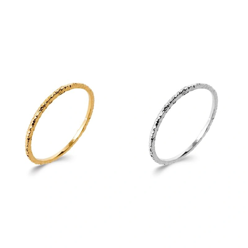 Bague fine au relief irrégulier, offrant un rendu texturé et organique. Son design brut et discret en fait un bijou facile à porter seul ou en accumulation.