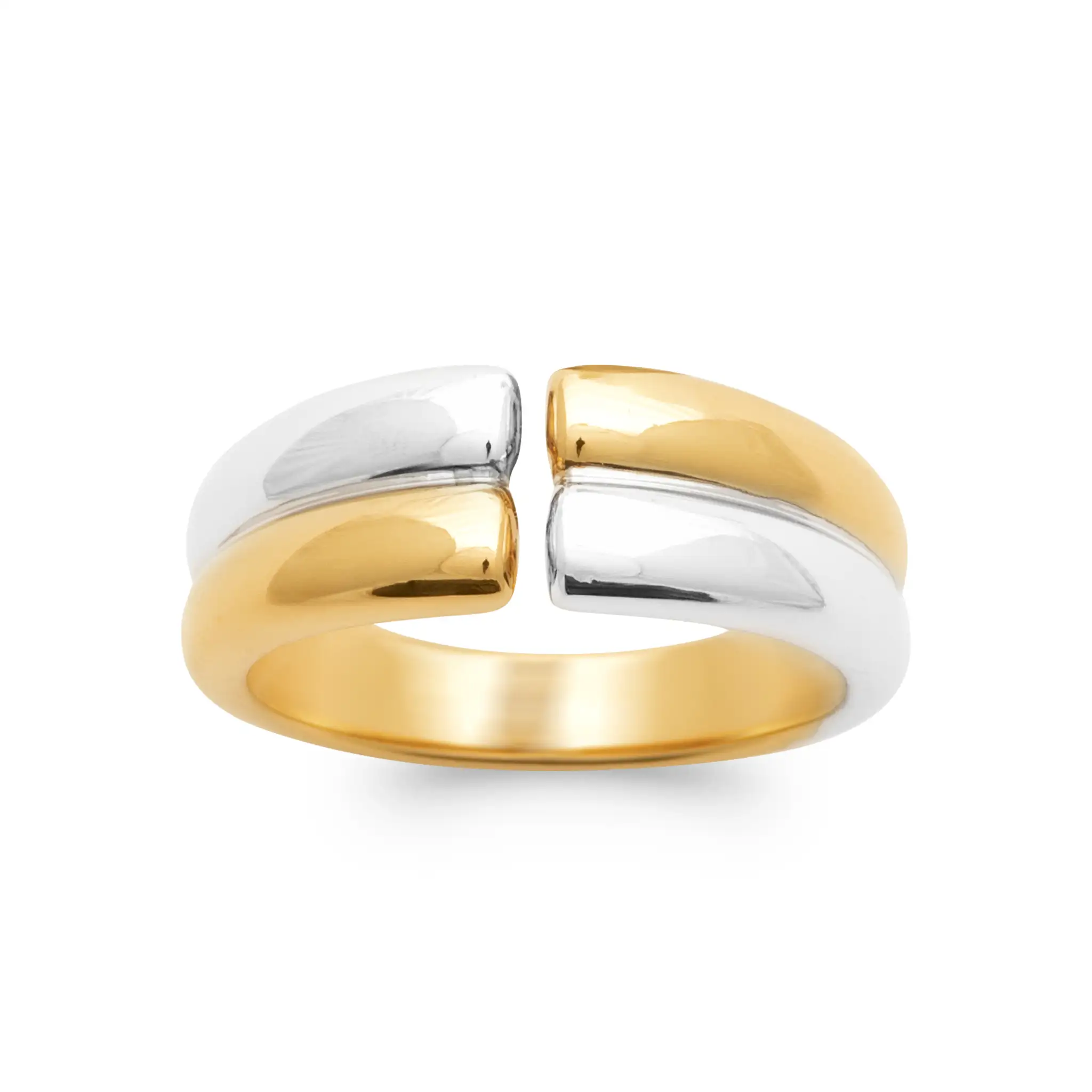 Bague bicolore au design ouvert, mêlant finitions dorée et argentée. Un bijou moderne et élégant, facile à porter au quotidien. Collection Bicolore.