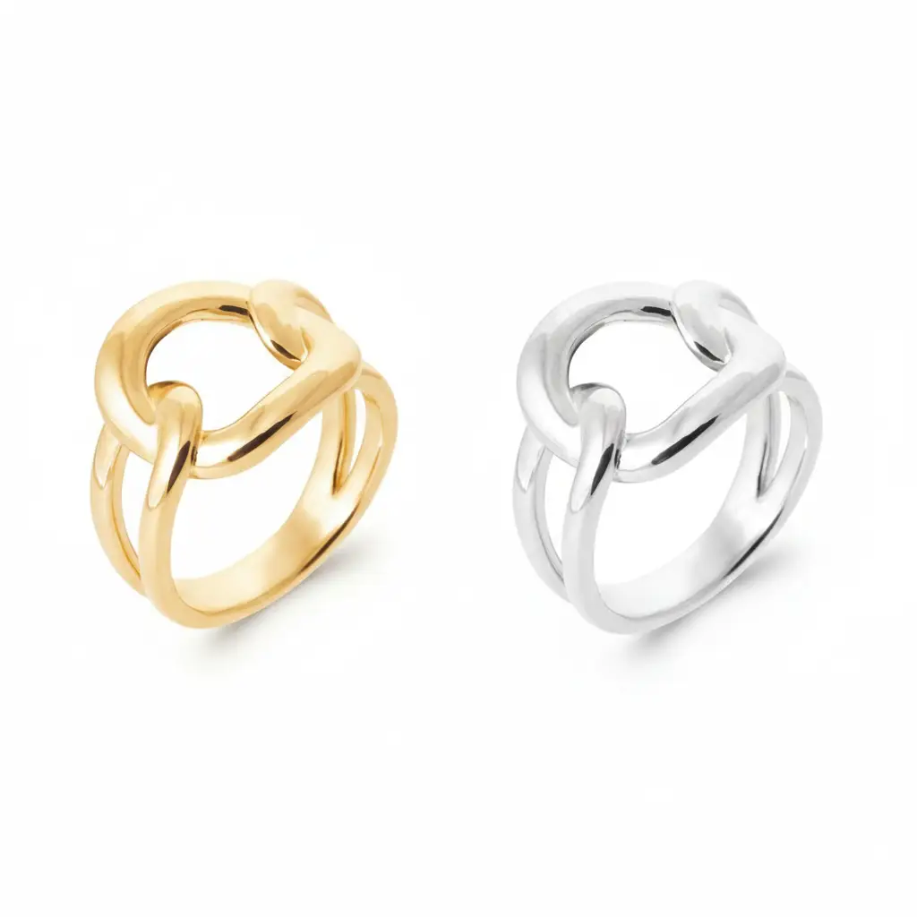 Cette bague au design entrelacé joue avec les courbes et les volumes pour créer un effet graphique et résolument moderne. Un bijou affirmé, idéal pour sublimer aussi bien une tenue du quotidien qu’un look plus tendance. Collection Temporelle.