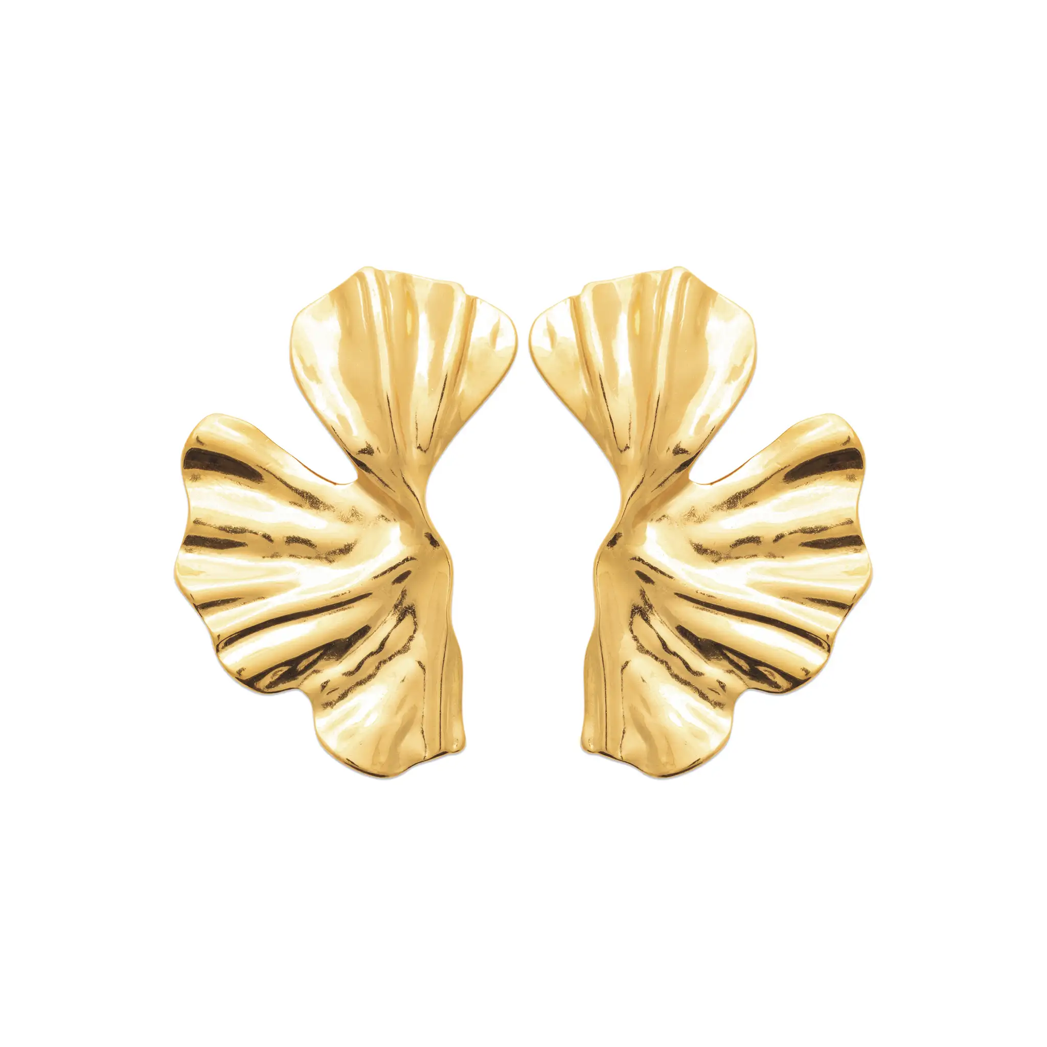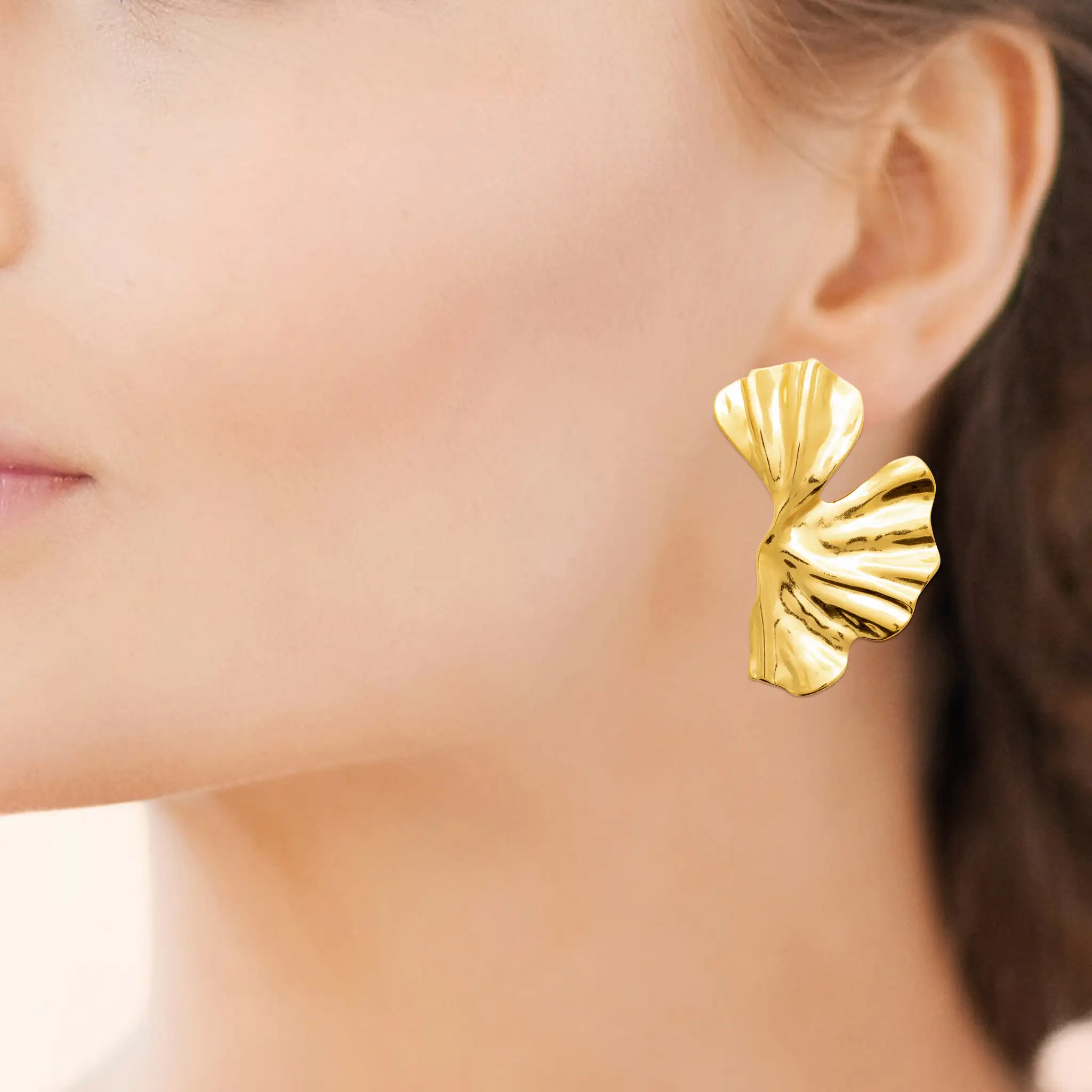 Inspirées des formes naturelles, ces boucles d’oreilles dorées jouent sur des courbes fluides et un effet martelé/ondulé qui capte la lumière. Collection Temporelle.